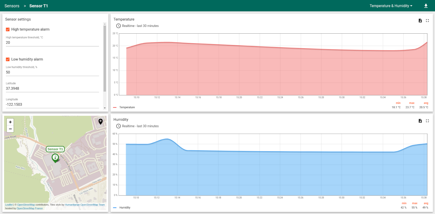Temperature & Humidity monitoring template represents a generic solution suitable for multiple applications. With this template you get an interactive dashboard with the ability to manage sensors and user-friendly alarm configurations.